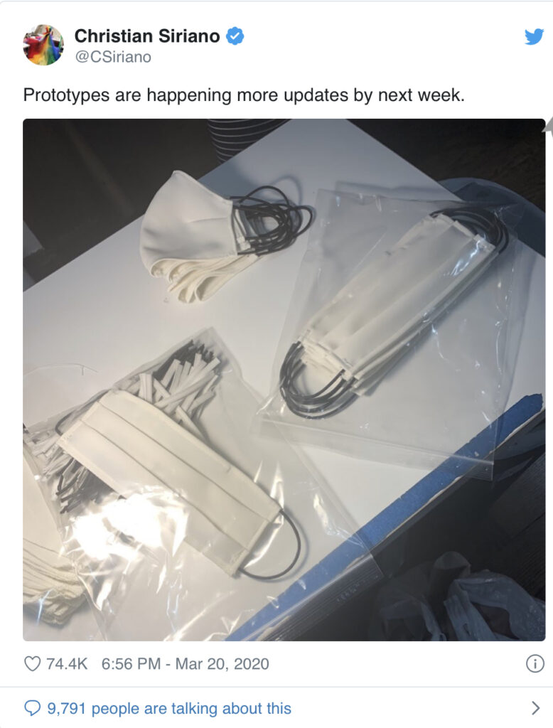 On Friday 20 March, American fashion designer Siriano reached out to New York governor Andrew Cuomo on Twitter to offer to make face masks if the politician says the state is in need. “If @NYGovCuomo says we need masks my team will help make more,” Siriano’s tweet read. “I have a full sewing team still on staff working from home that can help.”