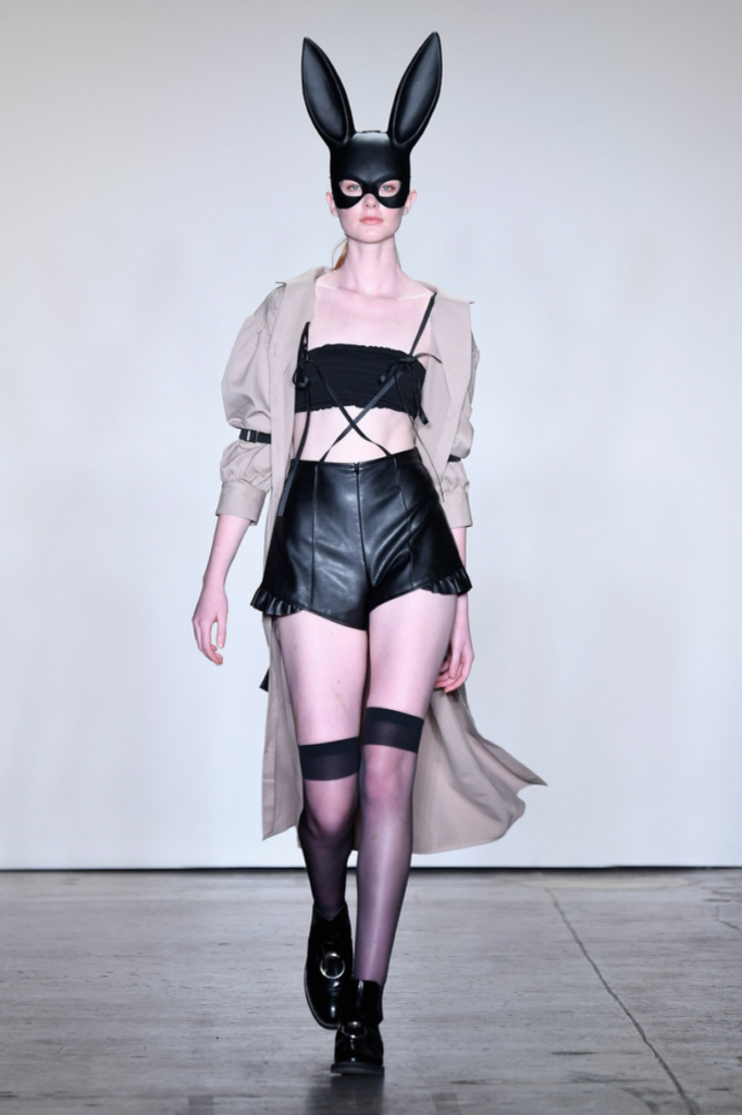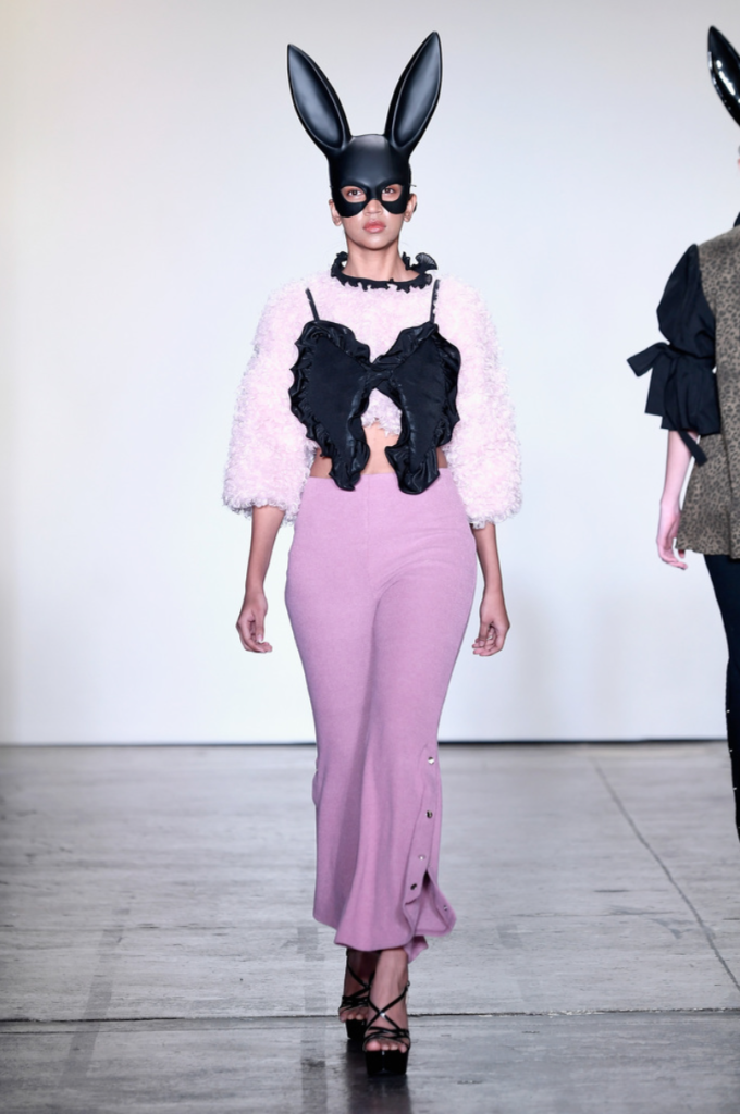 First up, FICTION TOKYO, a brand by Japanese designer Monaca Nishi. A seductive saxophone medley played out as models clad in black bunny-ear masks strided down the runway. Monaca took a retro spin for her collection ‘Favorite Heroine’ drawing inspiration from the lead of a childhood movie. A fun and feminine feel took prominence with high-waisted ensembles; leather shorts, flared sleeves, and silky fabrics. A subtle colour palette with soft pinks, khaki, burgundy, and yellow were mixed. Soft knitted flared pants paired with a cropped fluffy sweater in pale pink was a stand out look.