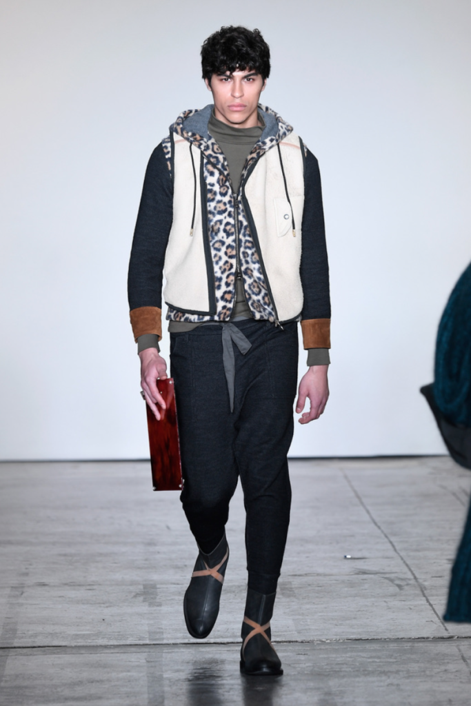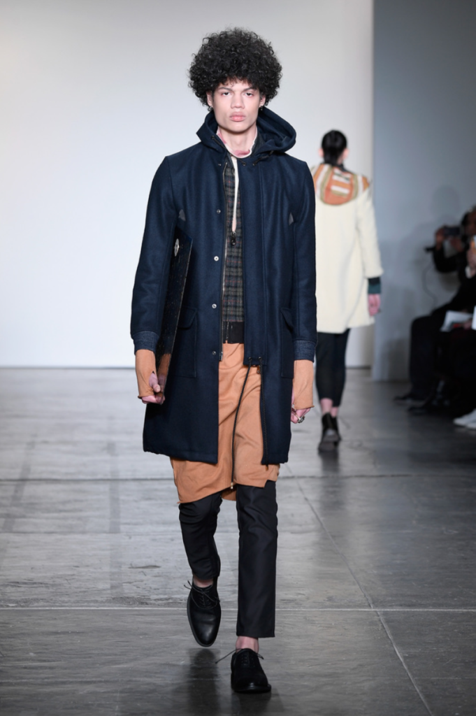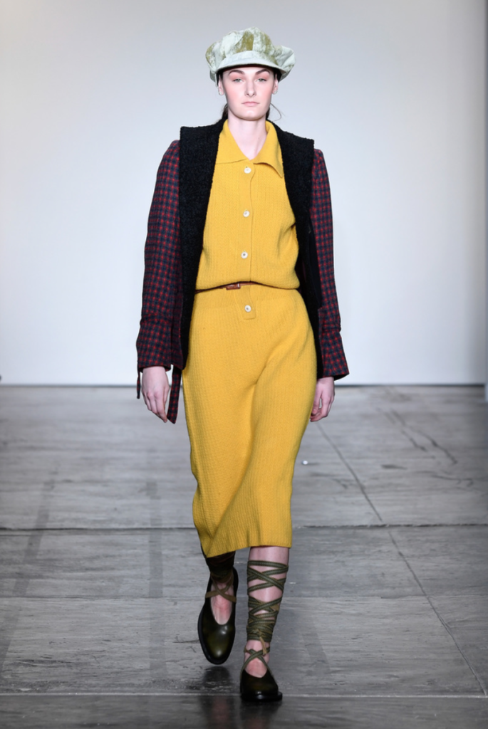 Japanese brand WILDFRÄULEIN71 put forward a unisex collection inspired by the strong but transient beauty of a woman with a courageous man by her side. Designer Roop Shimura brought a more artisanal feel to the collective show, looking into the conceptual relationship between energy and form. An eclectic mix of colour and texture, layered outfits were pieced together with matte and shiny textures in autumnal shades. A highlight was a yellow knitted button up dress paired under a belted red check jacket, with a green pageboy hat to complete the look. In an artistic manner, painted glass art pieces were carried by the models, who at the end of the runway, pointed to the sky, and announced their names and where they are from. An expressive presentation to close the show.