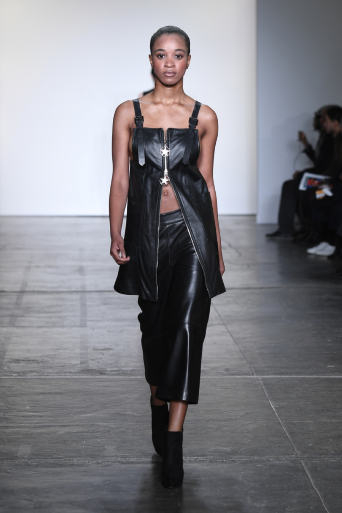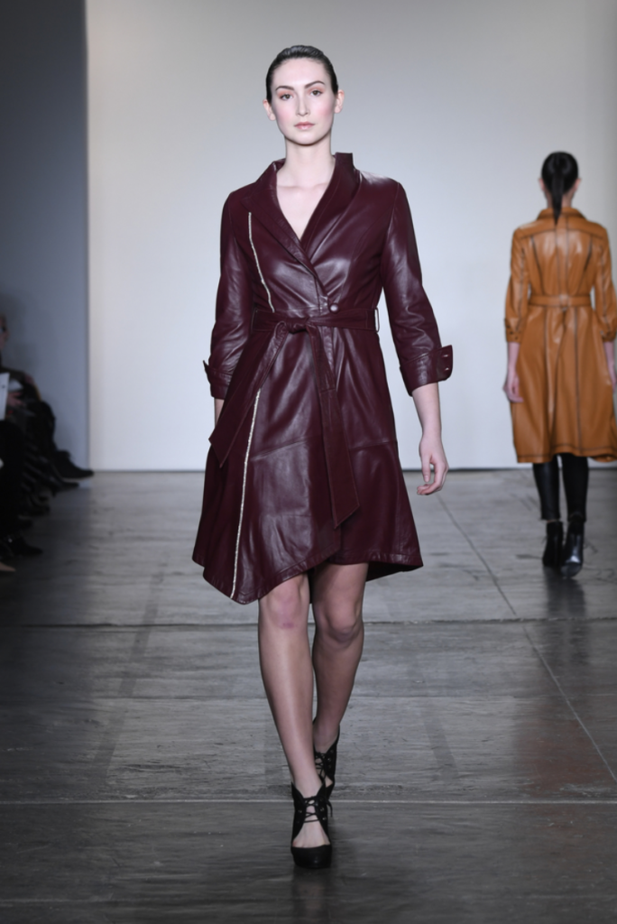 Vancouver designer Melissa Yin showcased flattering cuts with her leather-based brand, presenting ‘Nine to Five’- a collection of fashion forward pieces to take you from day to night. Bright lipstick red leather was contrasted with cream and black shades in fitted silhouettes. An elegant full-length black dress with short-capped sleeves and a cinched-in waist formed a striking look. An inspiring attention to detail was shown with silver star-shaped zippers and rhinestone trim which beautifully caught the light.