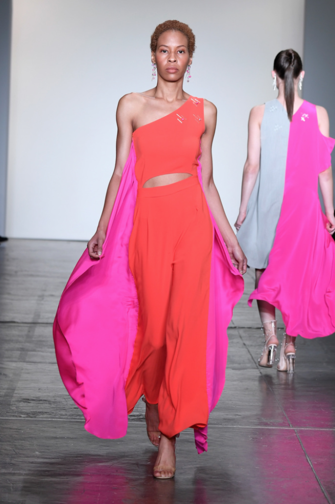 Next in the line-up was Caroline Ann, a U.S designer from Atlanta, who draws inspiration from fond childhood memories. The concepts of time and nostalgia have informed the clothes, exploring summer days spent at the beach. A collection geared towards the mild winters of the southern US with a fun touch of summer, we saw a vibrant palette of jewel pink, bold blue, and orange in light loose dresses and two pieces. Clever cutting and layering allows for pops of bright colour meshed with muted greys and an accent of print. Soft ruffles are inspired by the natural texture of sand dunes after being blown in the wind, and embellishments to suggest the sparkle of crushed up seashells are strategically placed throughout.
