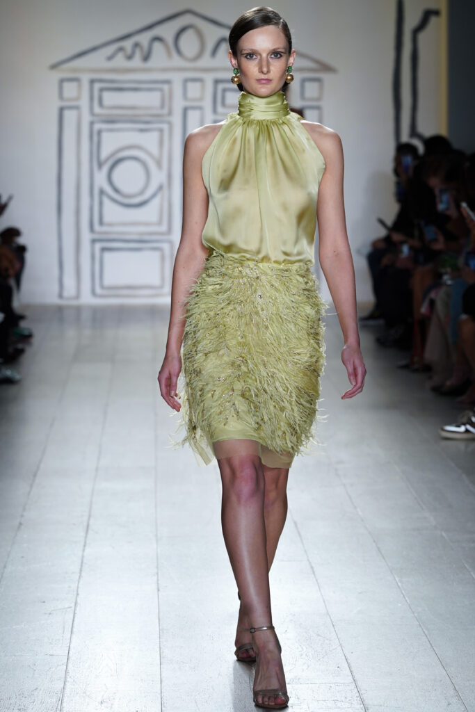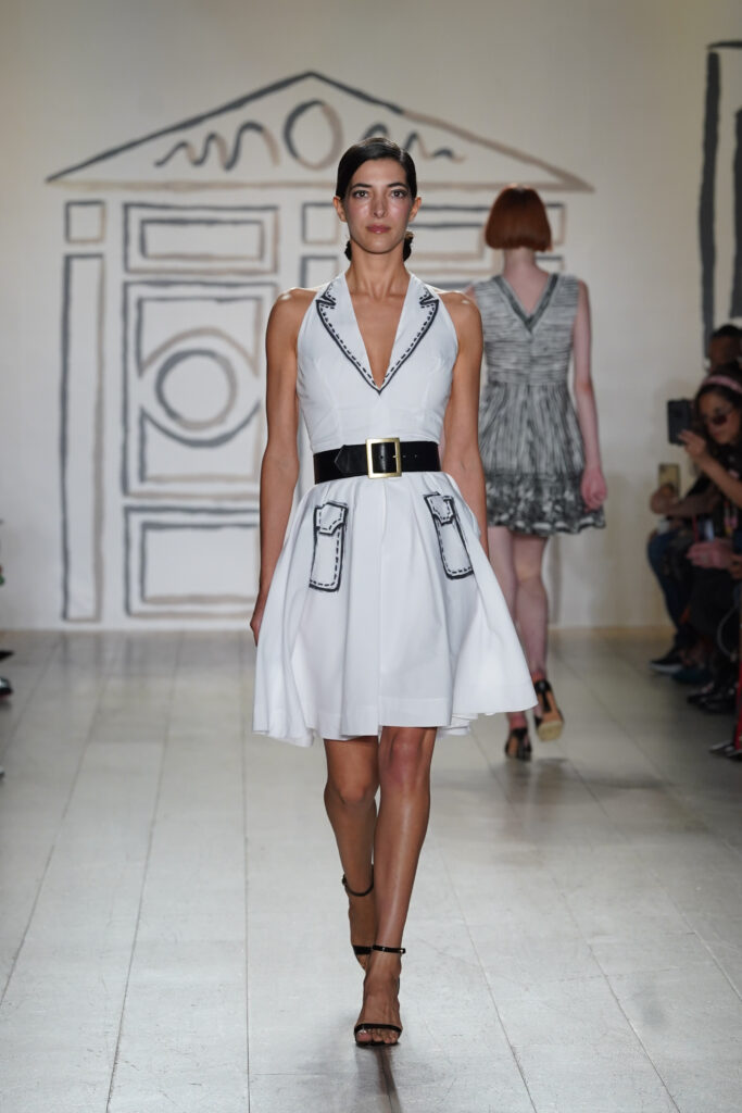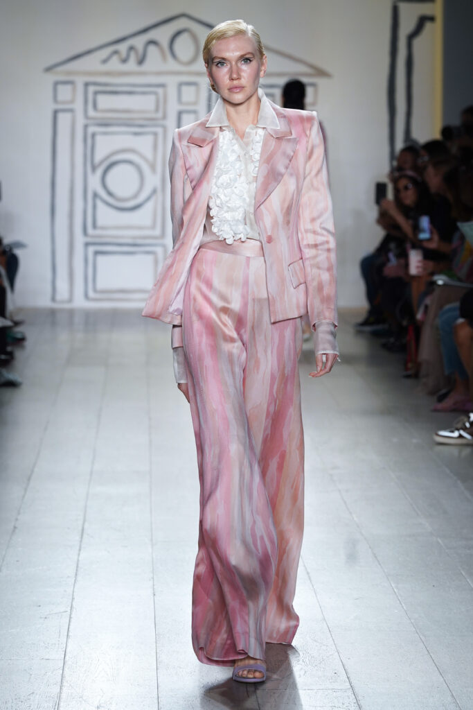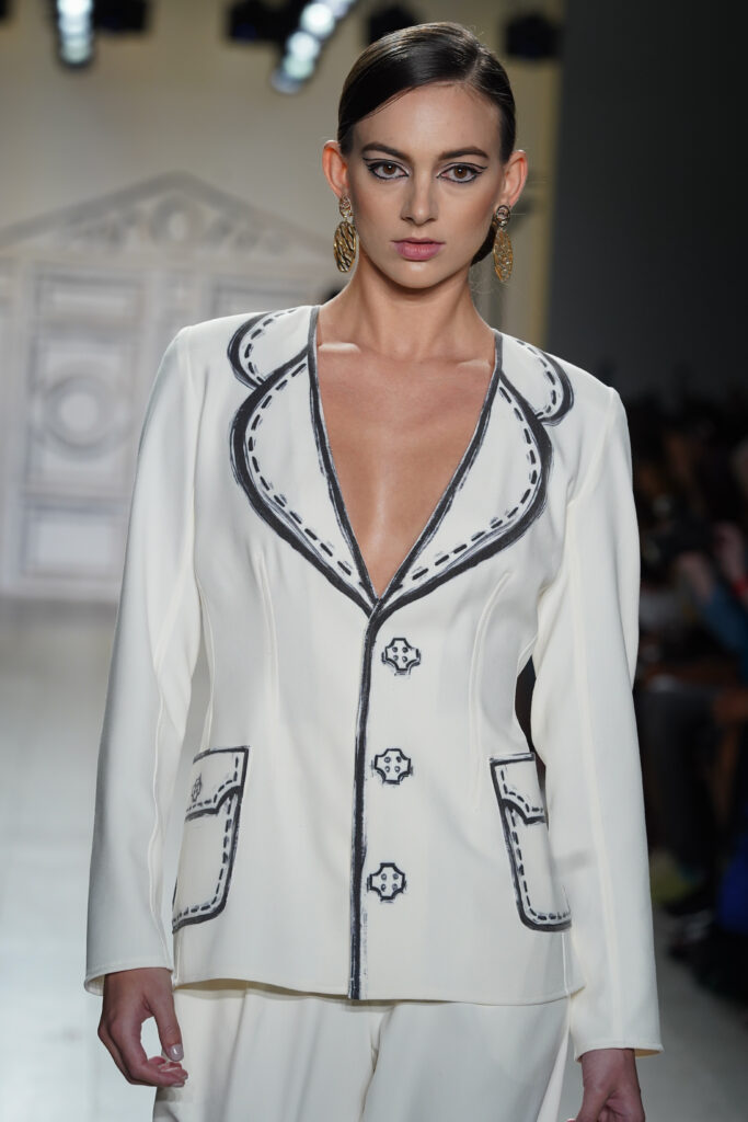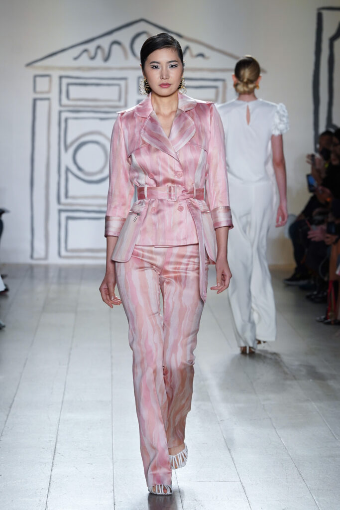 Kevan Hall’s Spring 2022 collection, “Brushstrokes,” responds to the elegance of a 1930’s Parisian multi-culture. By referencing Christian Berard’s signature painting style, Hall draws upon the influences of Berard’s contemporaries– including Swiss sculptor, Alberto Giacometti, and interior designer, Jean Michel-Frank. This legendary time in history birthed a new intersection for fashion, theatre, and interior design. By merging these disciplines, Hall’s collection translates trompe l’oeil details and architectural paneling into streamlined silhouettes for the modern woman. Collar and pocket details mirror accents found within a French interior.