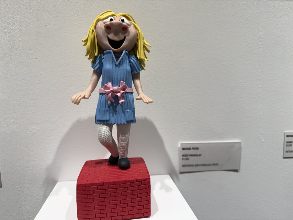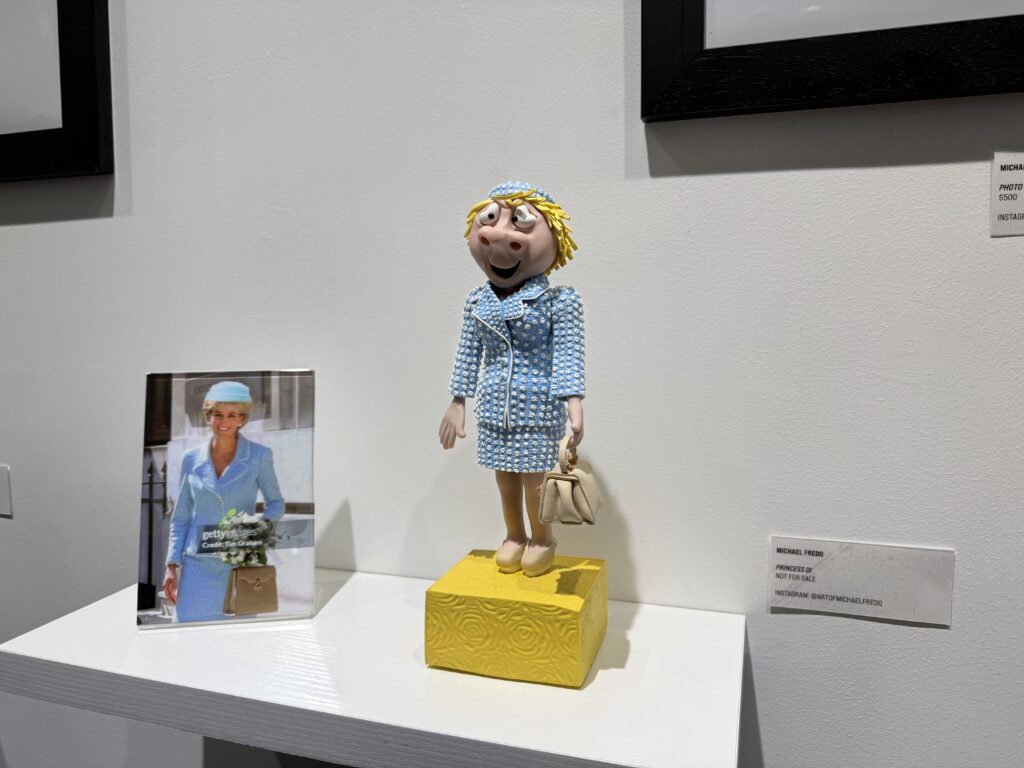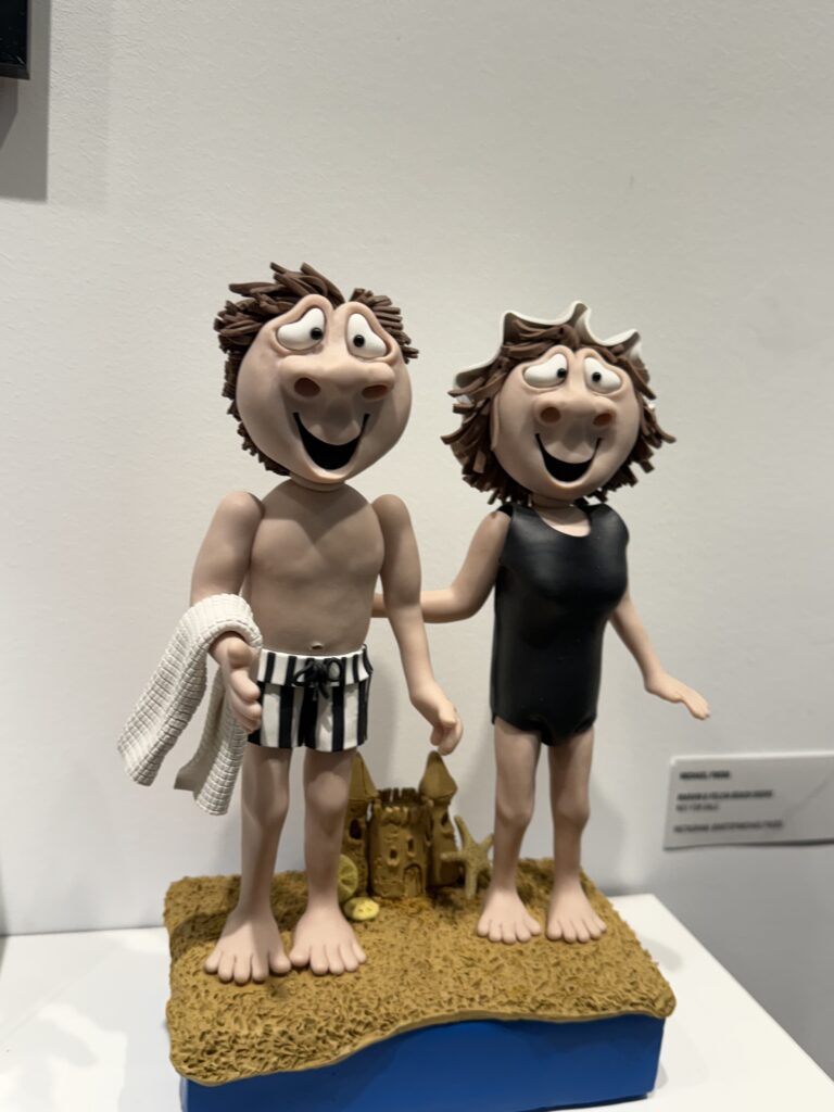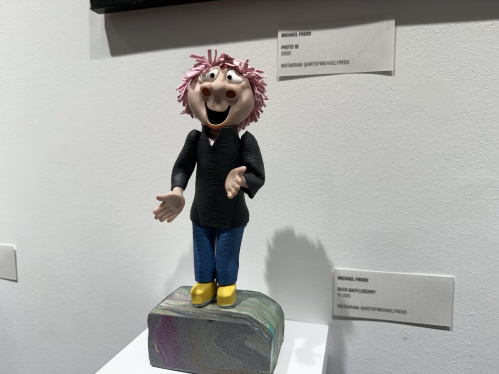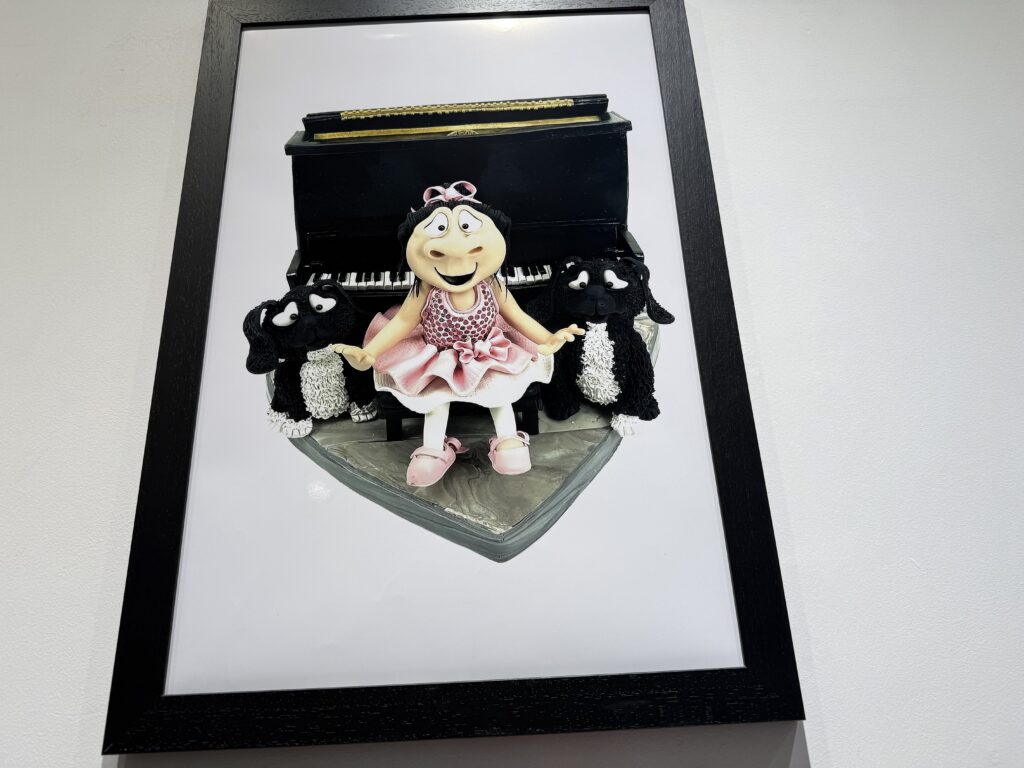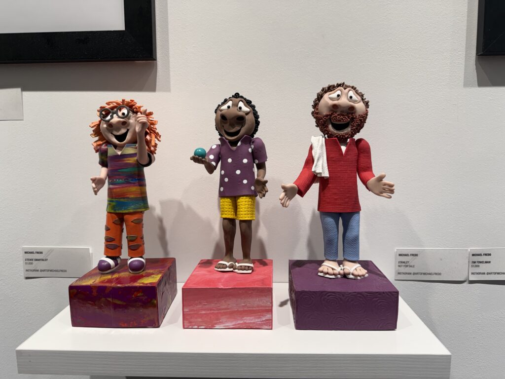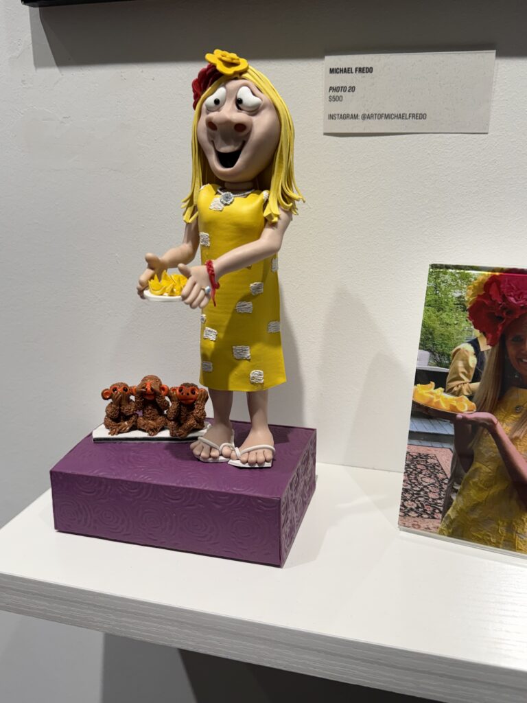 Walking through the gallery, Michael’s claymation figures immediately reminded me of the classic Davey and Goliath stop‑motion style — expressive faces, handcrafted textures, and characters that seem to possess their own autonomy. Each figurine felt like it had a backstory, a personality, and a moment frozen in time. His miniature scenes, photographs, and the duet video for The Moonlighters all work together to create a whimsical universe that feels both retro and refreshingly new.