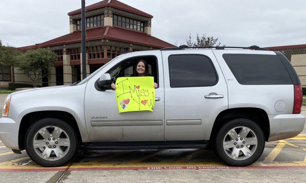 Holding a bright orange sign that read “I miss you,” Elisabeth, offered up some words of encouragement for her two & three-year-old students, letting them know that she can’t wait to see them again soon.